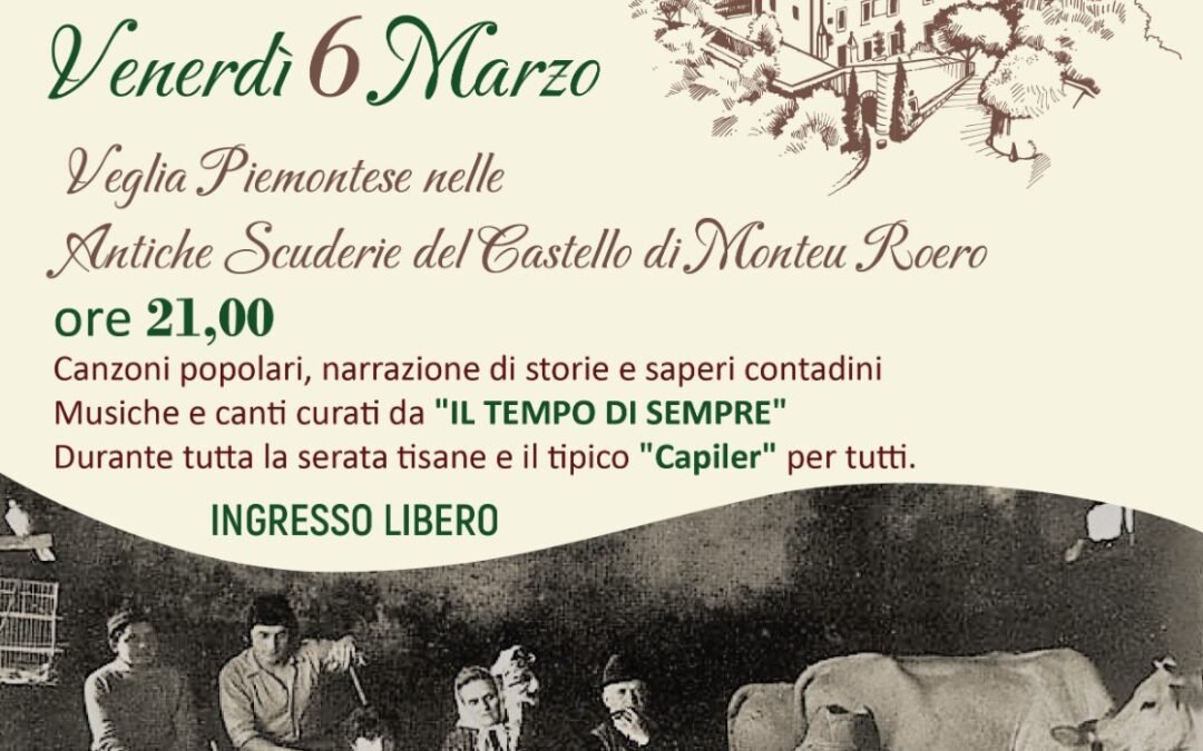 venerdì 6 marzo 2026 ore 21,00 Vecchie scuderie del castello di Monteu Roero: ” la vijà” per ricordare le antiche tradizioni. Racconti di masche e storie locali con la musica tradizionale del gruppo IL TEMPO DI SEMPRE. Tisane e CAPILER per tutti – Ingresso libero fino ad esaurimento posti. Info tel. 333.7678652 e 3470587825