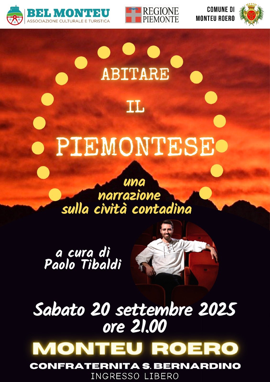 sabato 20 settembre ore 21,00 Confraternita di San Bernardino. Spettacolo “abitare il piemontese” di Paolo Tibaldi – Ingresso libero fino ad esaurimento posti. Info tel. 333.7678652 e 3470587825