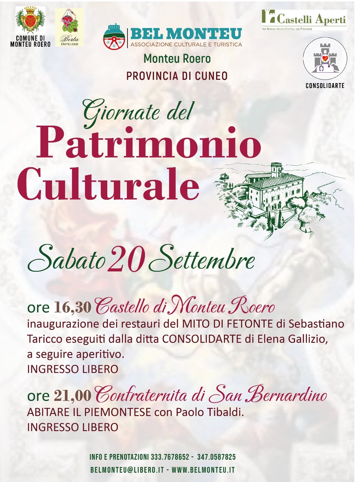 sabato 20 settembre ore 16,30 Castello di Monteu Roero. Inaugurazione dei restauri dell’affresco MITO DI FETONTE di Sebastiano Taricco da parte della Ditta CONSOLIDARTE di Elena Gallizio – aperitivo finale. ingresso libero fino ad esaurimento posti. Info tel. 333.7678652 e 3470587825