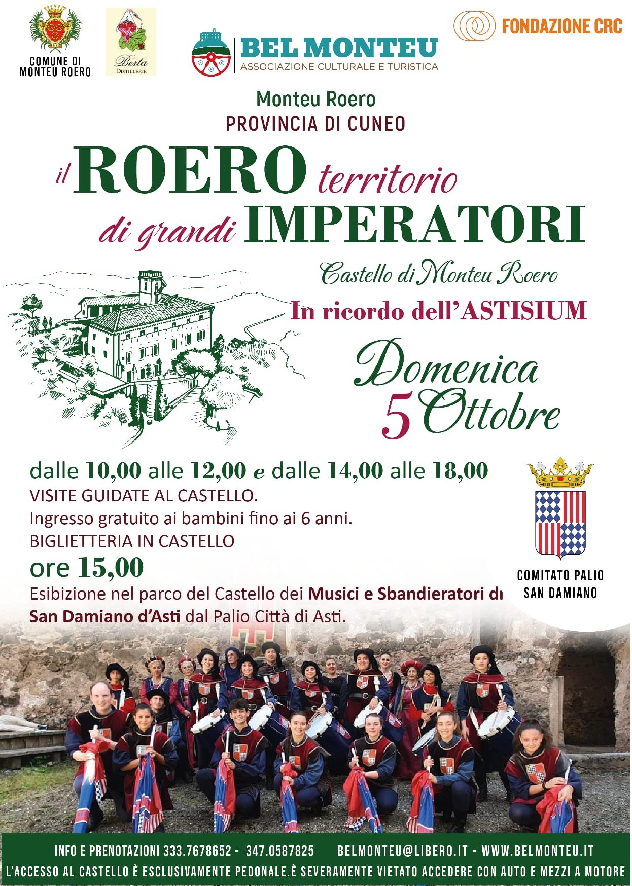IN RICORDO DELL’ASTISIUM. Roero territori di grandi Imperatori. In ricordo di Federico Barbarossa e Federico II, domenica 5 ottobre. Intera giornata con visite guidate al Castello e spettacolo pomeridiano con musici e sbandieratori di San Damiano d’Asti. Possibilità di utilizzare il ” sentiero dei CASTAGNI SECOLARI sulle tracce dell’IMPERATORE BARBAROSSA” – passeggiata di circa 7 km. libera a tutti ed in autonomia. Info tel. 333.7678652 e 3470587825