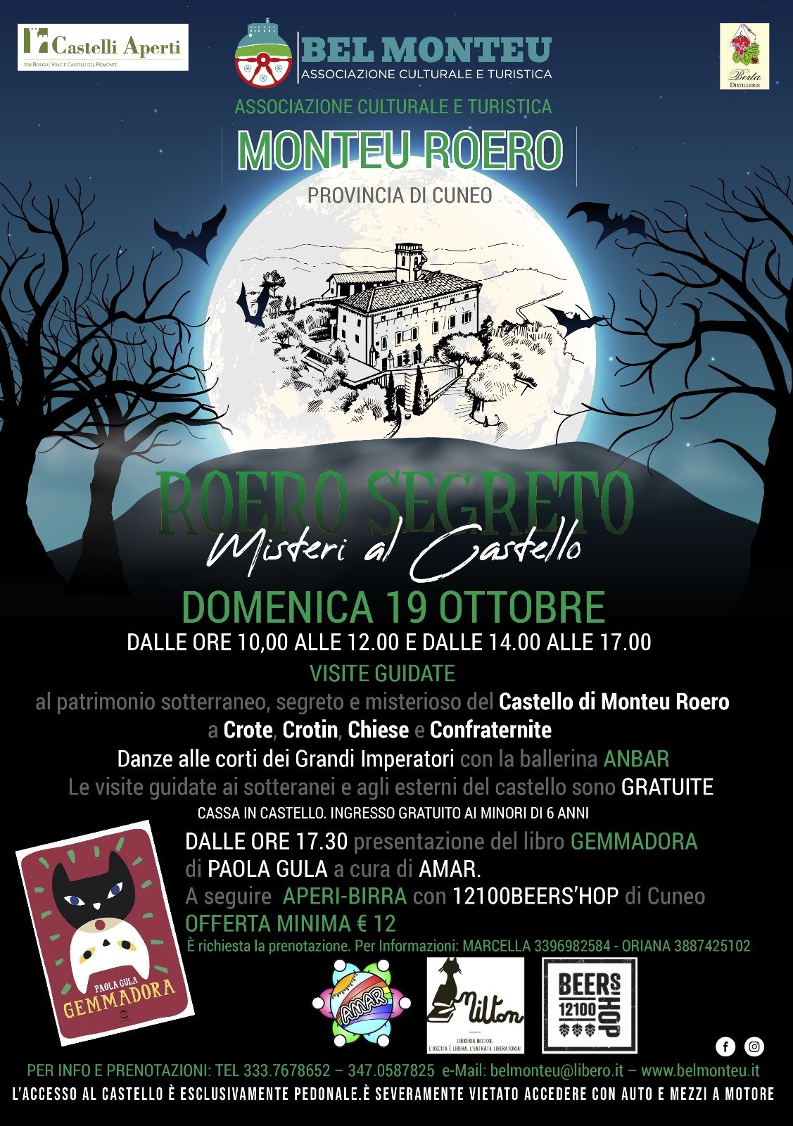 domenica 19 OTTOBRE “ROERO SEGRETO” e “MISTERI AL CASTELLO”. appuntamento unico ed ineguagliabile. Intera giornata per scoprire gli angoli più nascosti e segreti. Novità: il Castello con il nuovo restauro del mito di Fetonte, nuovi crotin e percorso implementato, presentazione del libro Gemmadora di Paola Gula con aperi-birra finale.Info e prenotazioni tel. 333.7678652 e 3470587825