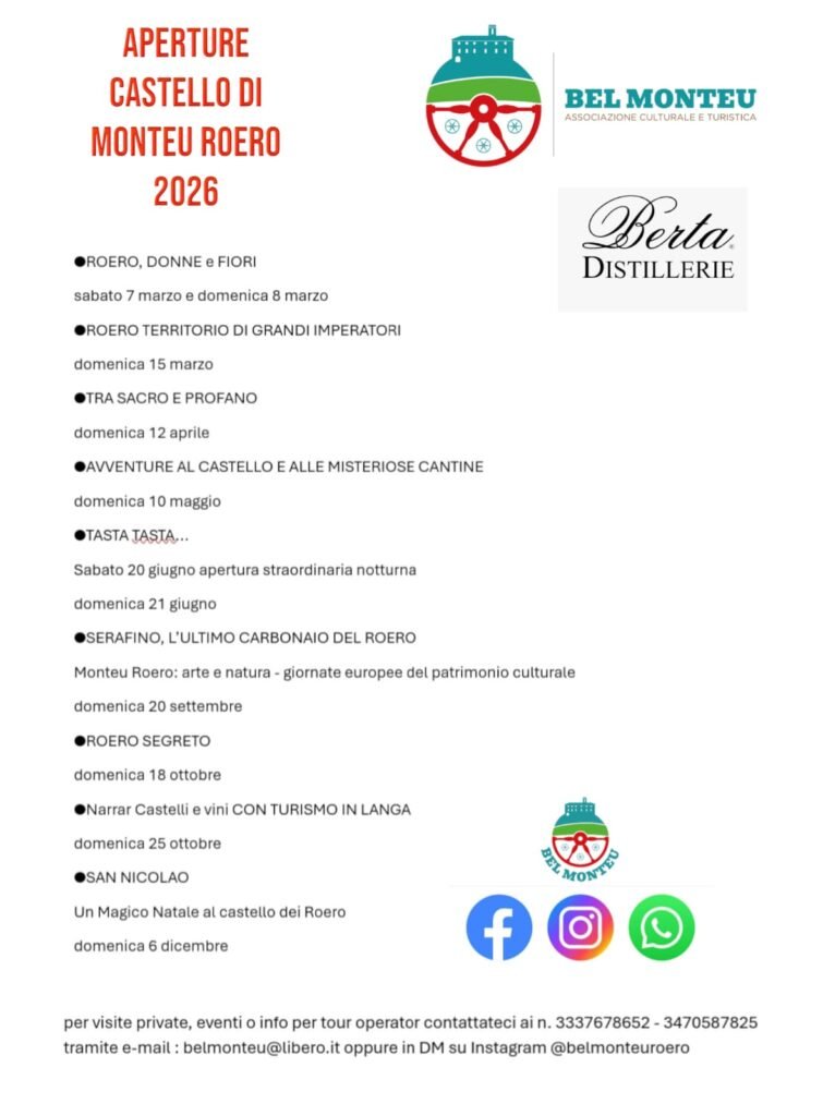 calendario APERTURE ORDINARIE CASTELLO DI MONTEU ROERO 2026. Info e chiarimenti tel. 333.7678652 e 3470587825 da BelMonteu | Gen 22, 2026 | Eventi | 0 commenti Invia commento Annulla rispostaIl tuo indirizzo email non sarà pubblicato. I campi obbligatori sono contrassegnati *Commento * Nome * Email * Sito web Salva il mio nome, email e sito web in questo browser per la prossima volta che commento.