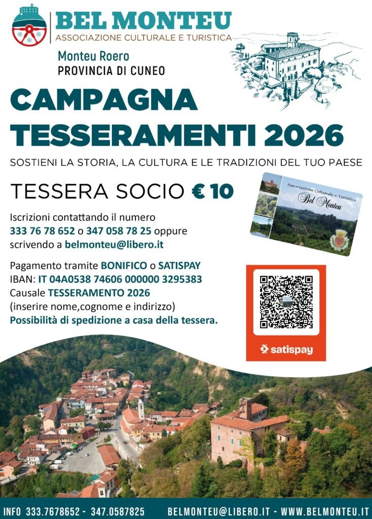 AVVISO: è possibile sostenere l’Associazione Culturale e Turistica Bel Monteu mediante tesseramento dell’importo di € 10,00. Info e chiarimenti tel. 333.7678652 e 3470587825 da BelMonteu | Dic 11, 2025 | Eventi | 0 commenti Invia commento Annulla rispostaIl tuo indirizzo email non sarà pubblicato. I campi obbligatori sono contrassegnati *Commento * Nome * Email * Sito web Salva il mio nome, email e sito web in questo browser per la prossima volta che commento.